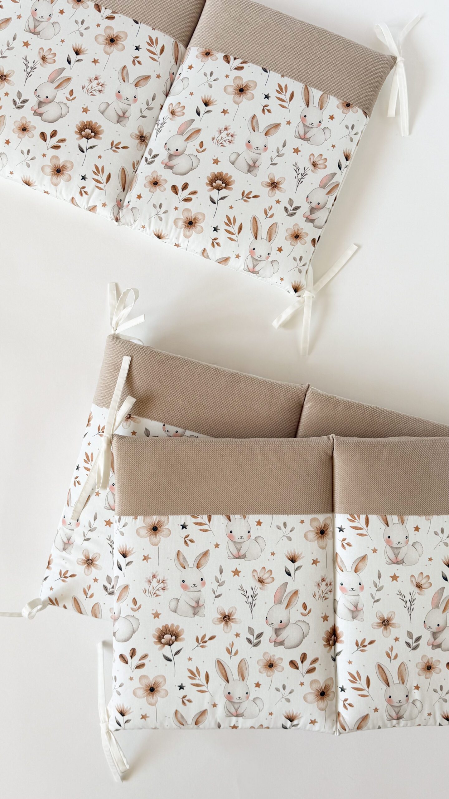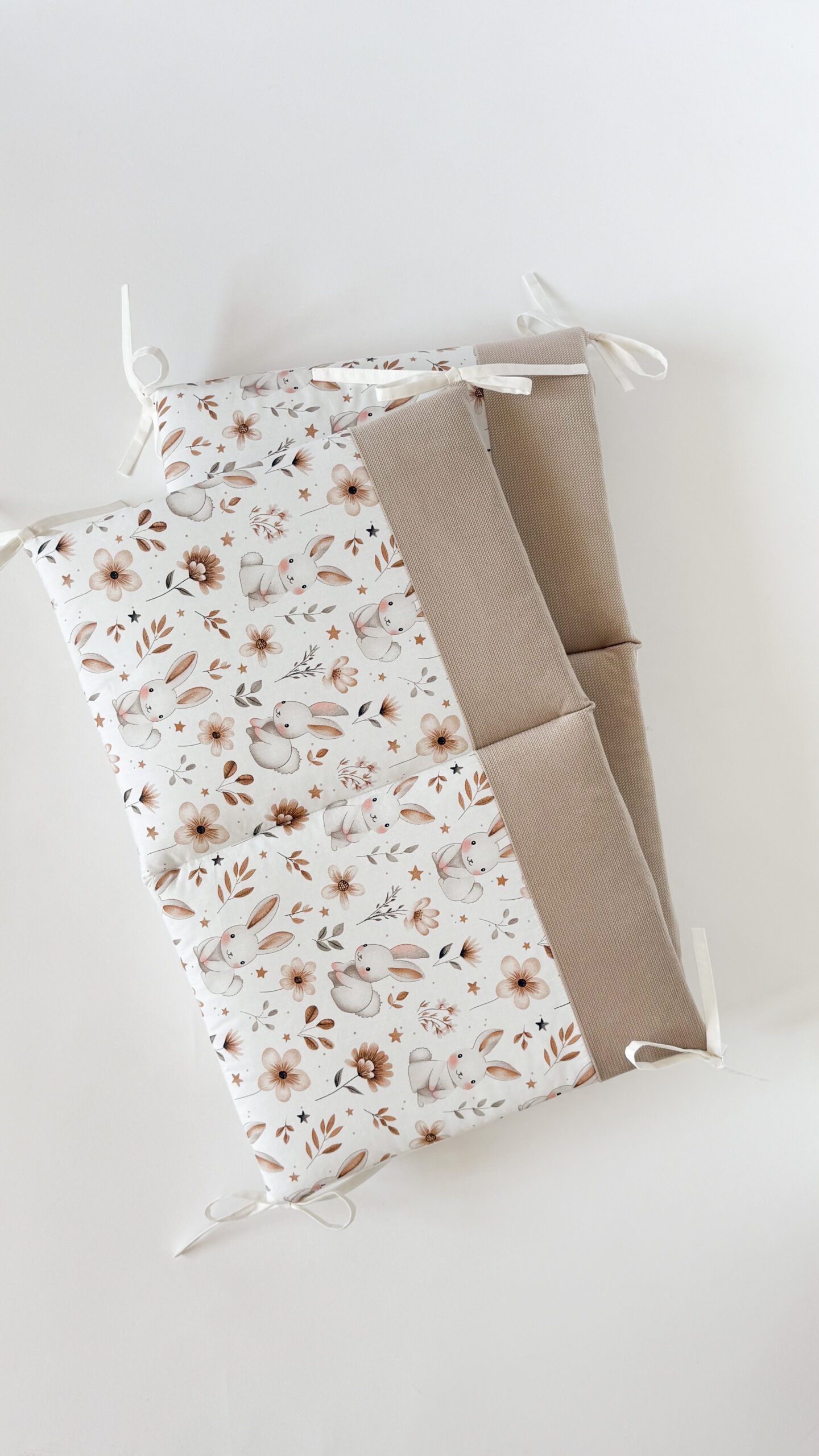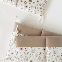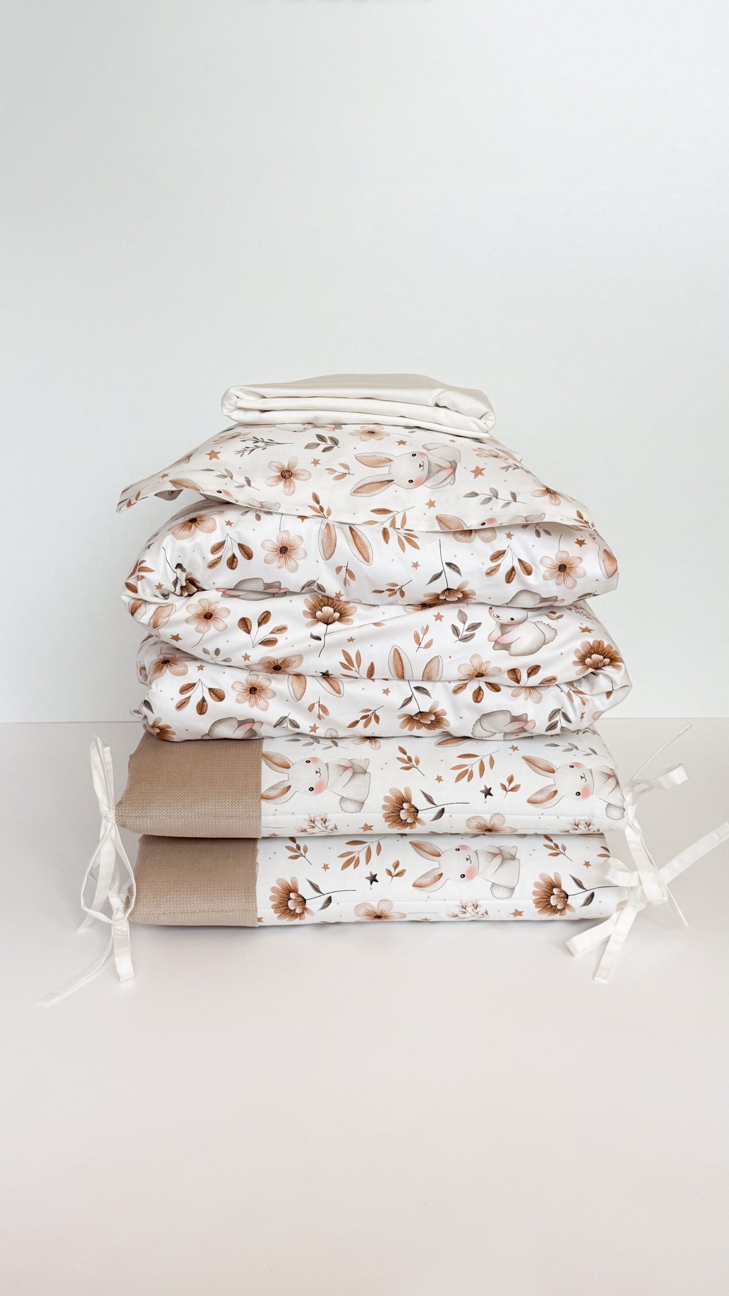 Setul din 6 unități are apărătorii din bumbac satinat uniton, ales cu atenție, pentru a se potrivi necesităților celor mici, are nuante fine și delicate. Bumbacul este cea mai potrivită stofă pentru bebeluși, e inofensivă, naturală și plăcută ca atingere.