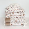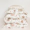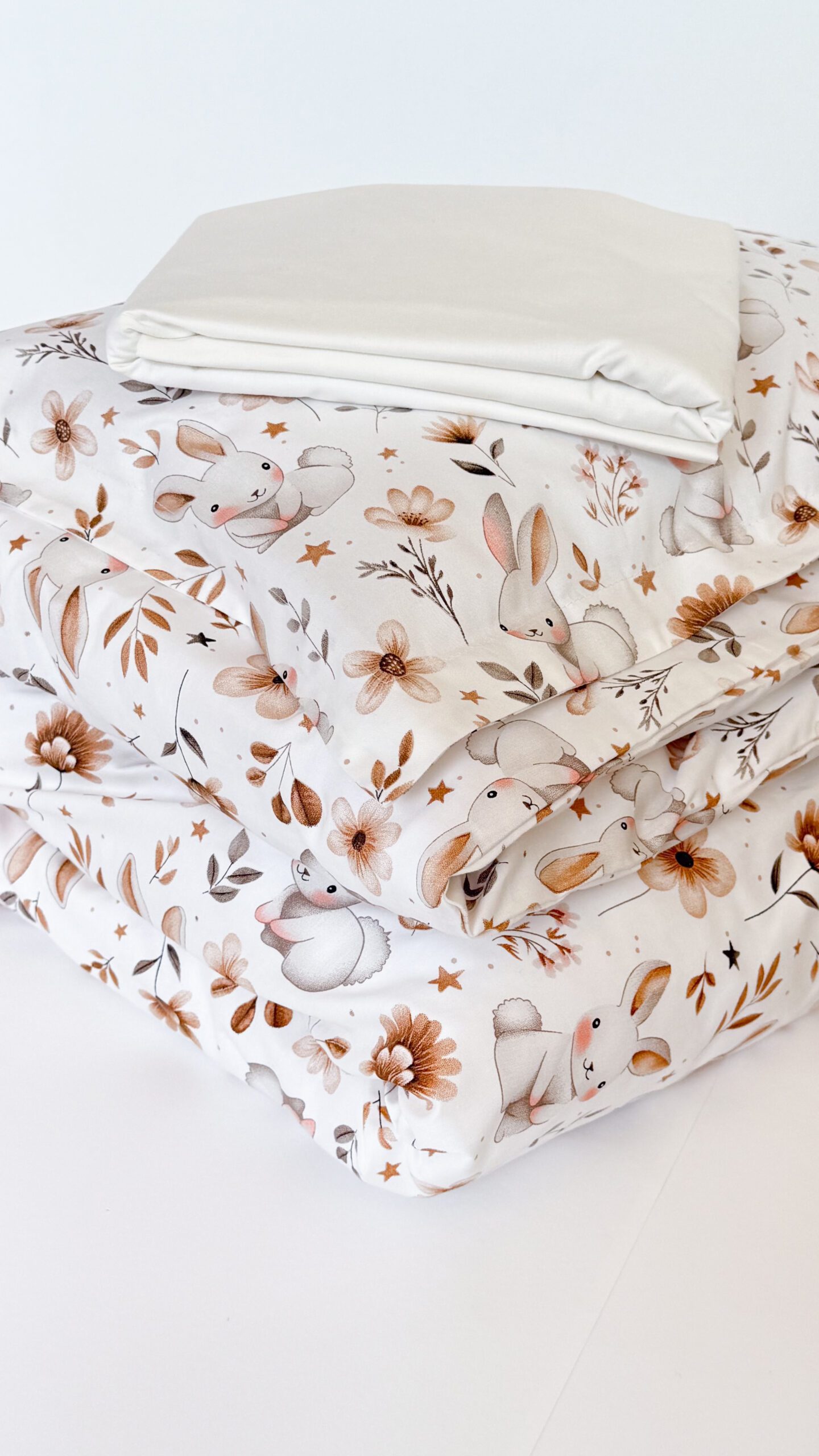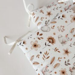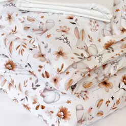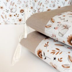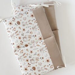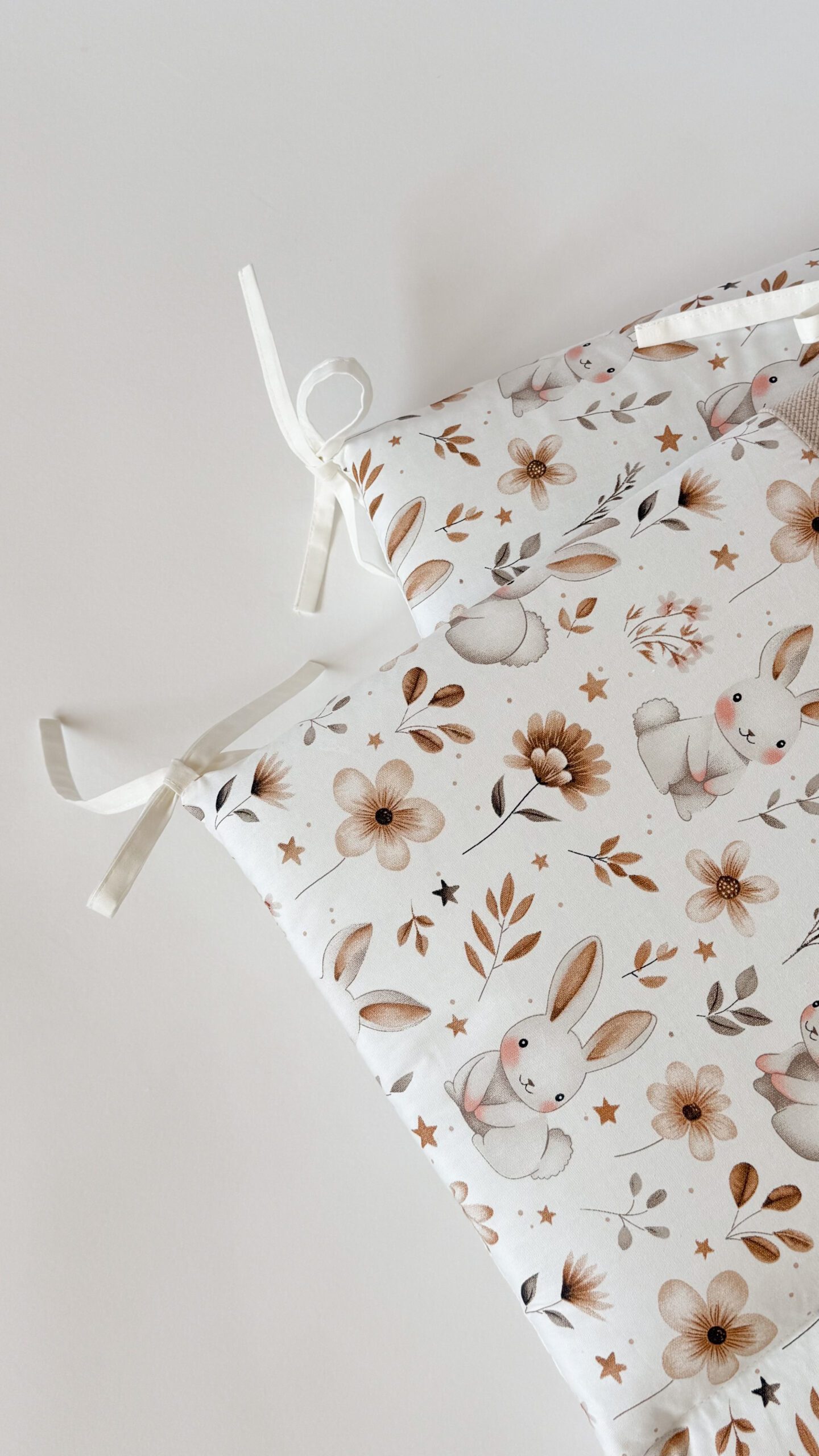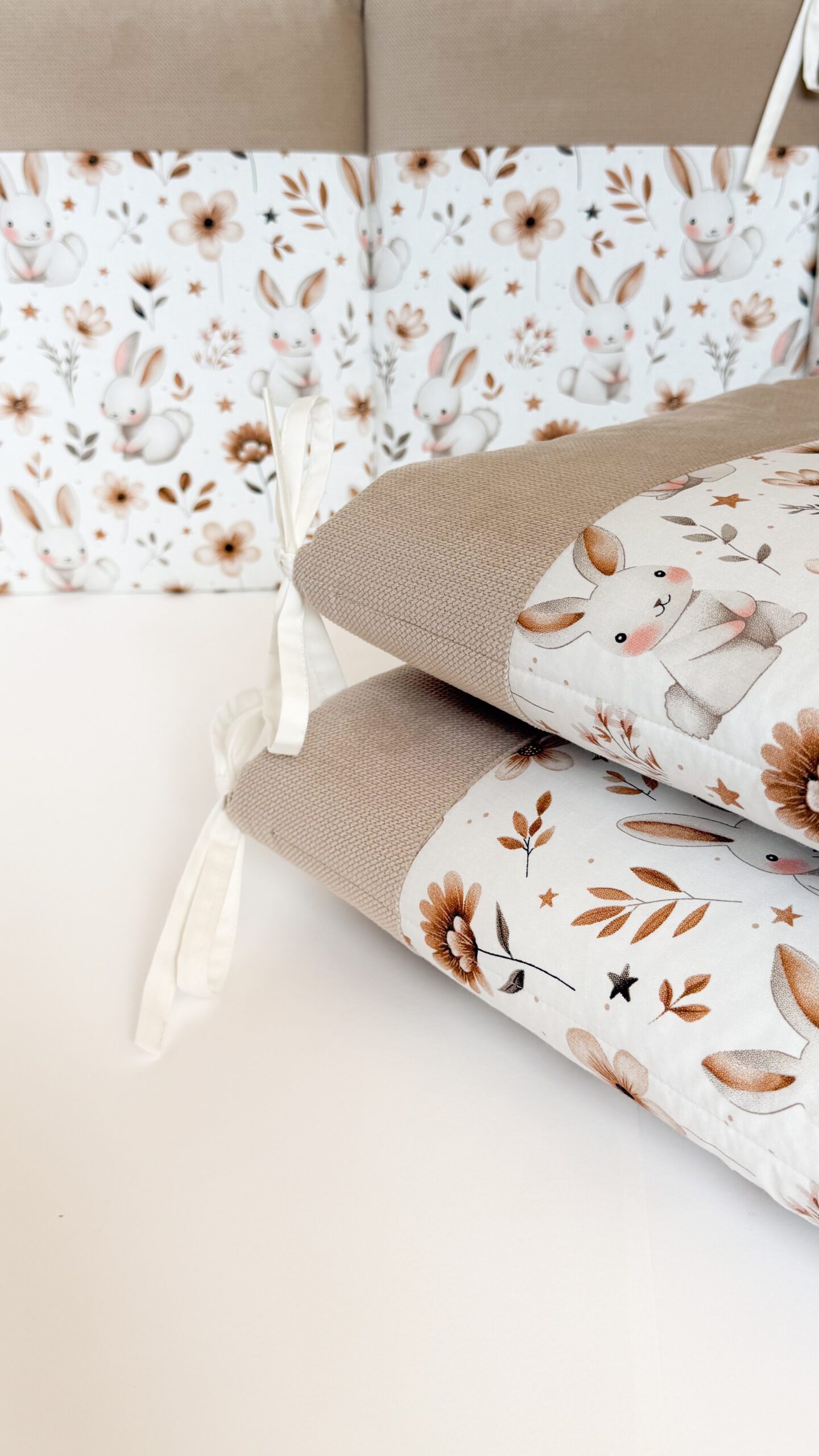 Setul din 6 unități are apărătorii din bumbac satinat uniton, ales cu atenție, pentru a se potrivi necesităților celor mici, are nuante fine și delicate. Bumbacul este cea mai potrivită stofă pentru bebeluși, e inofensivă, naturală și plăcută ca atingere.