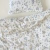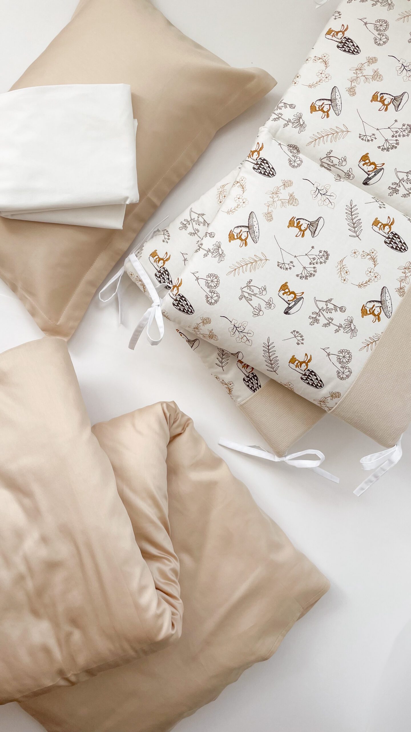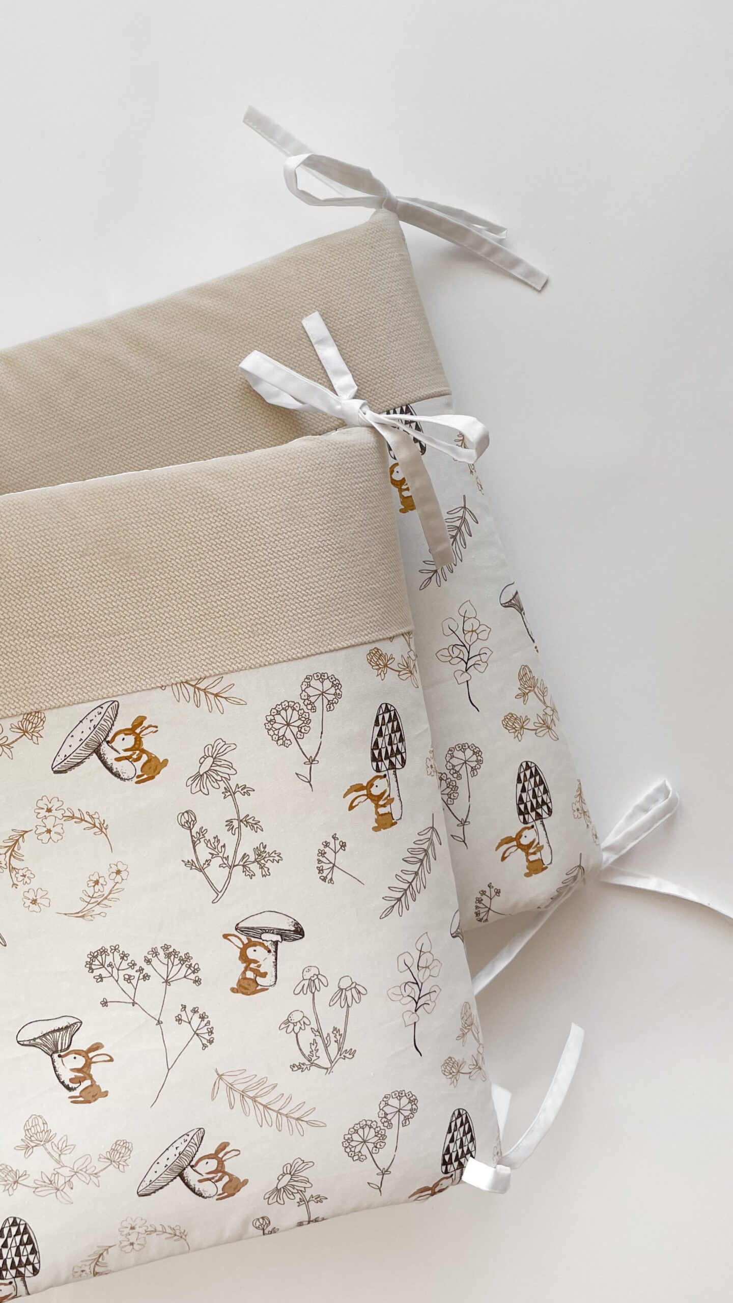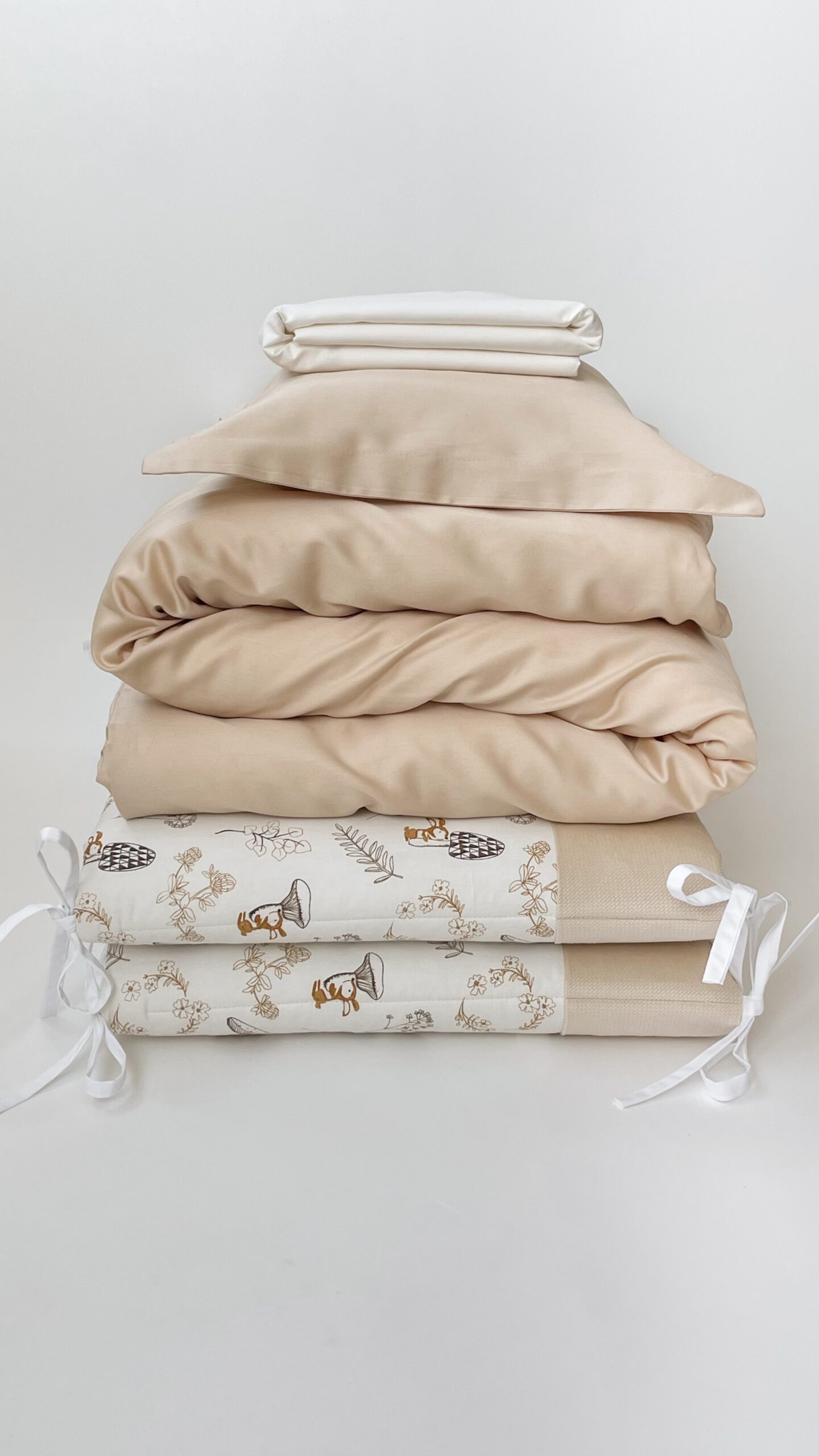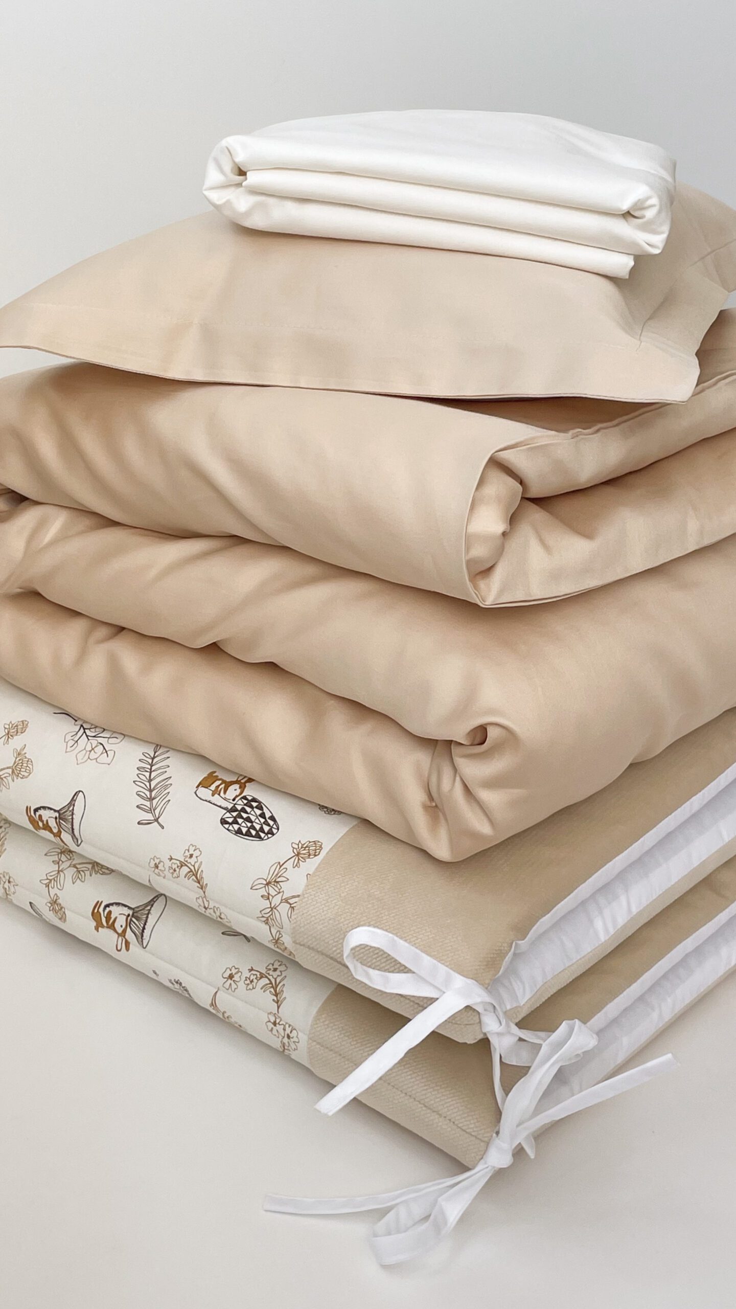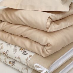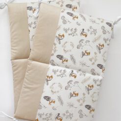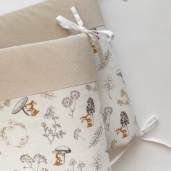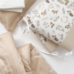 Setul din 6 unități are apărătorii din bumbac satinat uniton, ales cu atenție, pentru a se potrivi necesităților celor mici, are nuante fine și delicate. Bumbacul este cea mai potrivită stofă pentru bebeluși, e inofensivă, naturală și plăcută ca atingere.